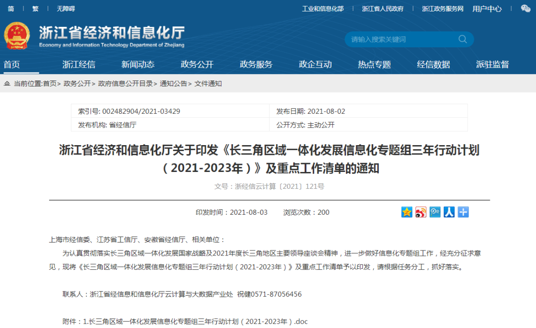 为认真贯彻落实长三角区域一体化发展国家战略及2021年度长三角地区主要领导座谈会精神,进一步做好信息化专题组工作,经充分征求意见,浙江省经信厅近日印发《长三角区域一体化发展信息化专题组三年行动计划(2021-2023年)》及重点工作清单。