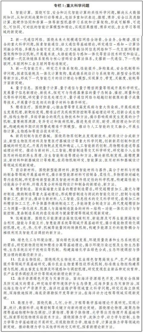 (一)重大科学问题。重点开展智能计算、新一代通信网络、新一代智能芯片、量子信息、精准医疗、新药创制与医疗器械、前沿新材料、精密制造、低碳能源、绿色化工与环境治理、农业生物性状、海洋资源绿色开发与灾害防治、数理力学等基础研究。