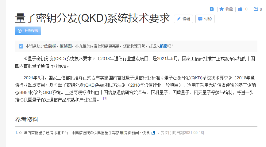 国家工信部近期批准并正式发布实施国内首批量子通信行业标准《量子密钥分发(QKD)系统技术要求》(2018年通信行业重点项目)及《量子密钥分发(QKD)系统测试方法》(2018年通信行业一般项目),适用于采用光纤信道传输的基于诱骗态BB84协议的QKD系统。上述两项标准均由中国信息通信研究院牵头、国科量子、国盾量子、问天量子等参与编制,将进一步推动我国量子保密通信产品成熟和产业发展。