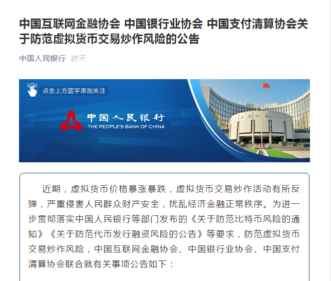 5月18日晚间,央行官微,互金协会、银行业协会、中国支付清算协会联合发布《关于防范虚拟货币交易炒作风险的公告》,提供虚拟货币交易服务涉嫌开展非法金融活动!