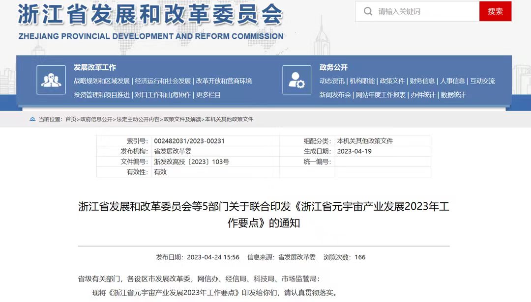为更好落实《浙江省元宇宙产业发展行动计划(2023—2025年)》,加快推动元宇宙技术创新、产业发展和生态构建,特制定浙江省元宇宙产业发展2023年工作要点。