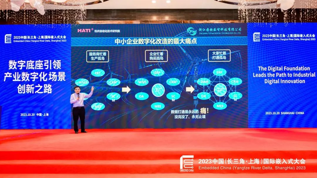 近日,以“数字底座引领产业数字化场景创新之路” 为主题的第十四届2023中国(长三角·上海)国际嵌入式大会在上海举行。大会聚焦数字底座工业生态、嵌入式基础软件、长三角紧缺人才创新培养、人工智能赋能智能制造等热门话题,从技术研讨、案例分享、产品展示到项目合作,全方位打造嵌入式领域专业人士交流的平台,共同研讨数字底座生态建设、软硬件研发、紧缺人才培养、适配应用等发展战略和实施经验,互动探讨人工智能时代数字底座嵌入式技术的发展与未来、机遇和挑战。本次大会杭州数字经济联合会任协办单位,杭州自动化技术研究院院长、杭州数字经济联合会会长 徐赤为大会作《数字底座引领产业数字化场景创新之路》的主题报告。数经联创始人徐玉清、秘书长明振东、办公室主任曾巧等出席相关会议。浙江特邀代表专家杭州电子科技大学继续教育学院院长 王雷,萧山技师学院数字技术学院院长、杭州数字经济联合会副秘书长 李四明,浙江工企信息技术股份有限公司总经理 张缪春出席并作主题报告。
