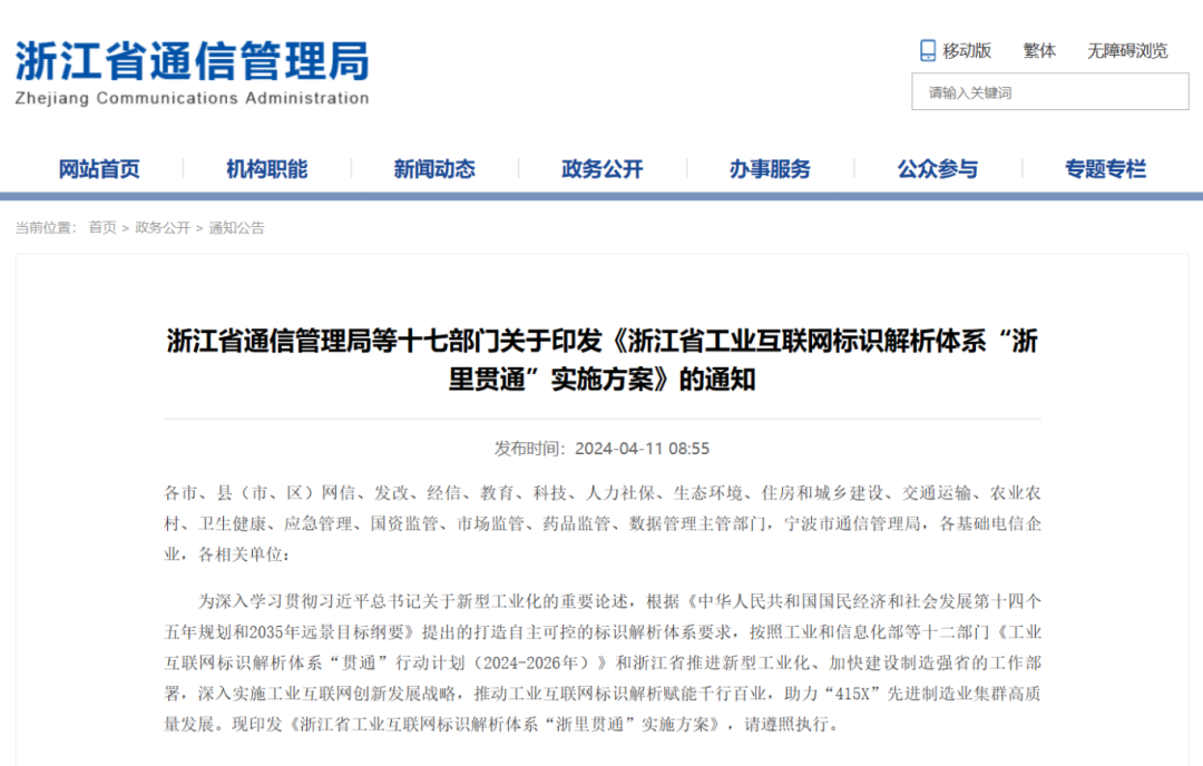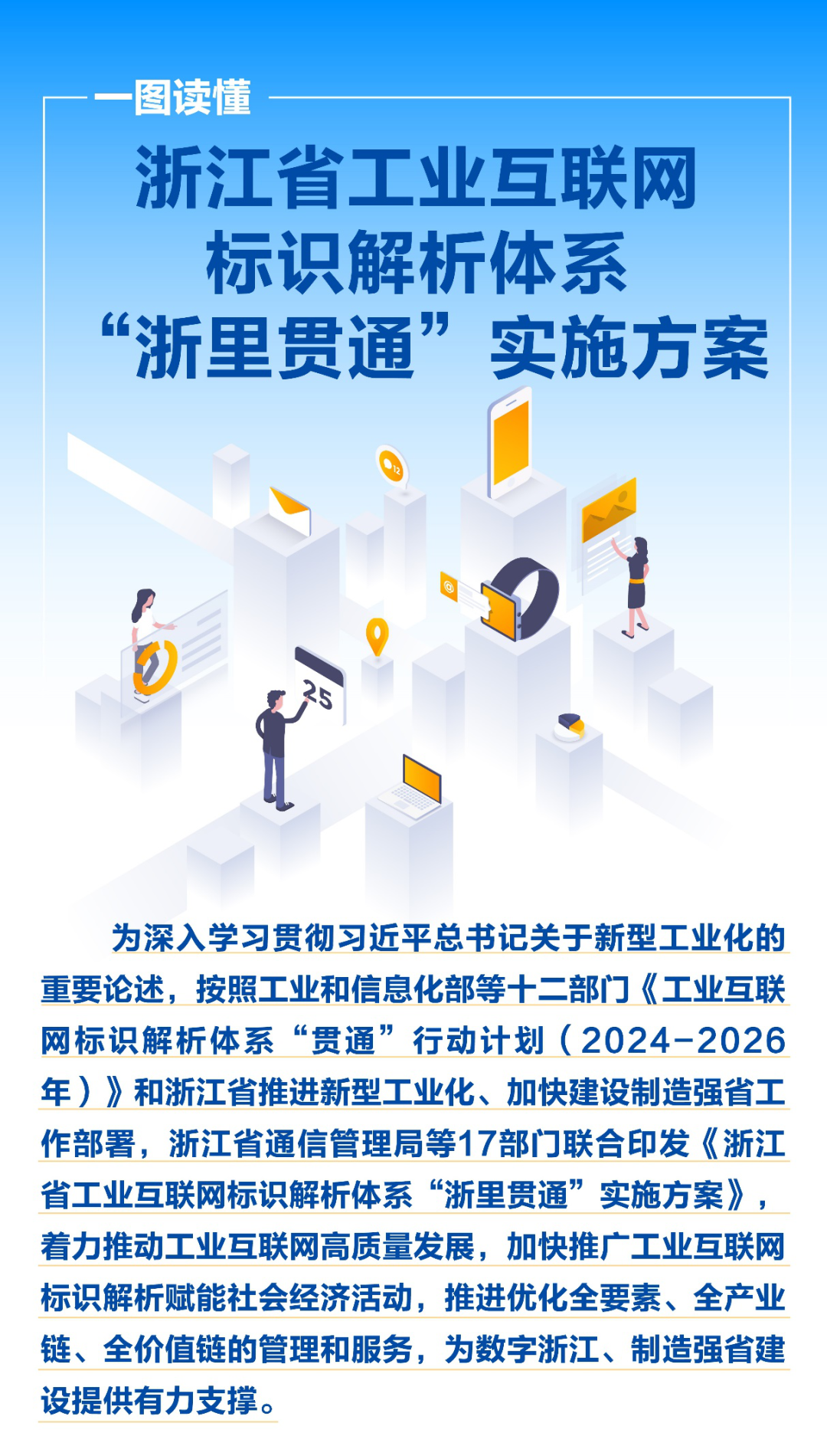 为深入学习贯彻习近平总书记关于新型工业化的重要论述,根据《中华人民共和国国民经济和社会发展第十四个五年规划和2035年远景目标纲要》提出的打造自主可控的标识解析体系要求,按照工业和信息化部等十二部门《工业互联网标识解析体系“贯通”行动计划(2024-2026年)》和浙江省推进新型工业化、加快建设制造强省的工作部署,深入实施工业互联网创新发展战略,推动工业互联网标识解析赋能千行百业,助力“415X”先进制造业集群高质量发展。现印发《浙江省工业互联网标识解析体系“浙里贯通”实施方案》,请遵照执行。