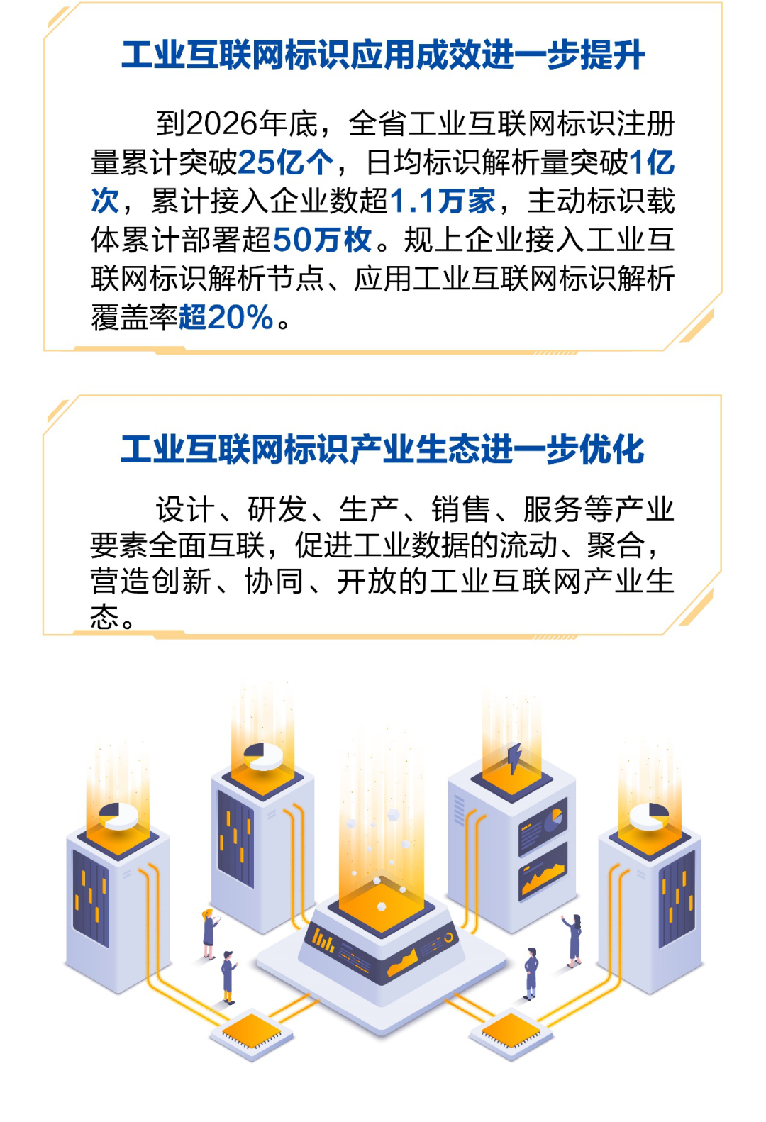 浙江省通信管理局等十七部门近日印发《浙江省工业互联网标识解析体系“浙里贯通”实施方案》(以下简称《实施方案》),聚焦服务能力提升、贯通疏堵强链、园区应用扩面、融合应用联动4大工程15项具体任务,提出到2026年,基本建成自主可控的标识解析体系,重点领域工业互联网标识实现规模应用,工业互联网标识解析产业生态发展壮大,对推动企业数字化转型、畅通产业链供应链、促进大中小企业和一二三产业融通发展的支撑作用不断增强。工业互联网标识解析体系进一步完善。工业互联网基础设施能力不断增强,全省累计建成标识解析二级节点超过15个,支撑两大类8个重点产业集群发展。工业互联网标识应用成效进一步提升。深化工业互联网标识解析体系在生产制造、消费品工业、绿色低碳、安全生产等领域的规模化应用,到2026年底,全省工业互联网标识注册量累计突破25亿个,日均标识解析量突破1亿次,主动标识载体累计部署超50万枚。工业互联网标识产业生态进一步优化。通过工业互联网标识解析体系,实现设计、研发、生产、销售、服务等产业要素的全面互联,提升协作效率,促进工业数据的流动、聚合,营造创新、协同、开放的工业互联网产业生态。