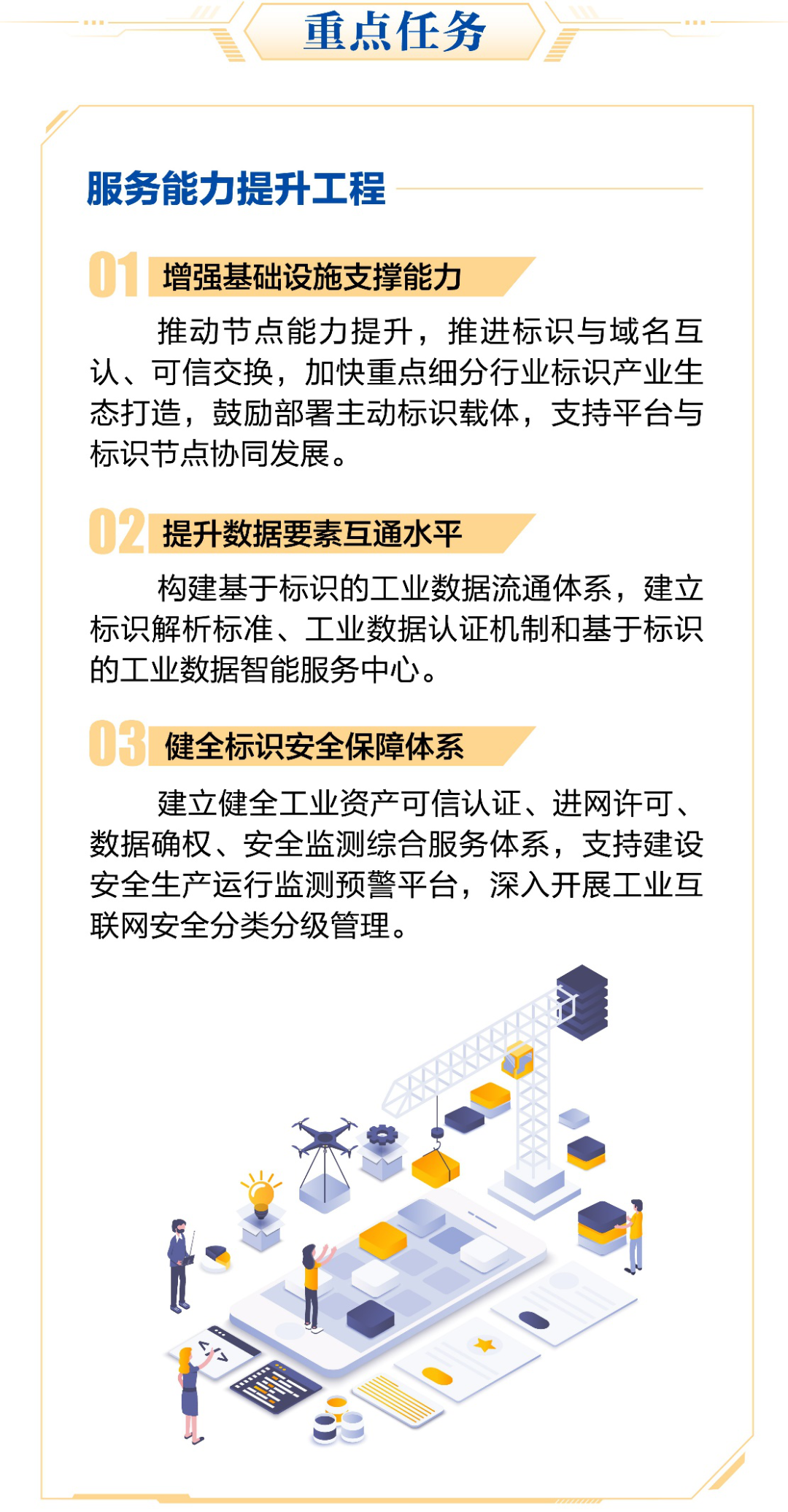 着力于标识解析数据底座价值发现,标识解析体系枢纽功能发挥,围绕赋能制造业智改数转网联主线,园区集群应用和产业链标识贯通主阵地,千行百业标识应用样板项目主窗口,实施四大工程,分层次体系化推进。
