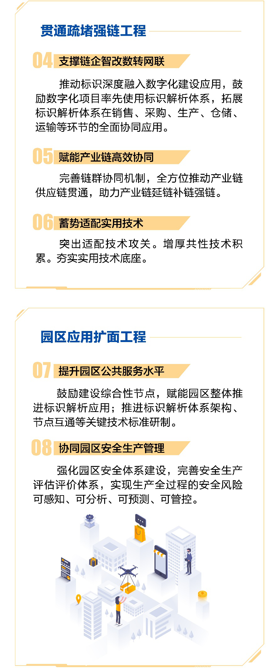 (二)贯通疏堵强链工程。以支撑制造业智改数转网联为主线,围绕8个重点产业集群,突出标志性产业链重点,大力推广标识应用,助力产业链延链补链强链,促进产业链供应链贯通高质量发展。