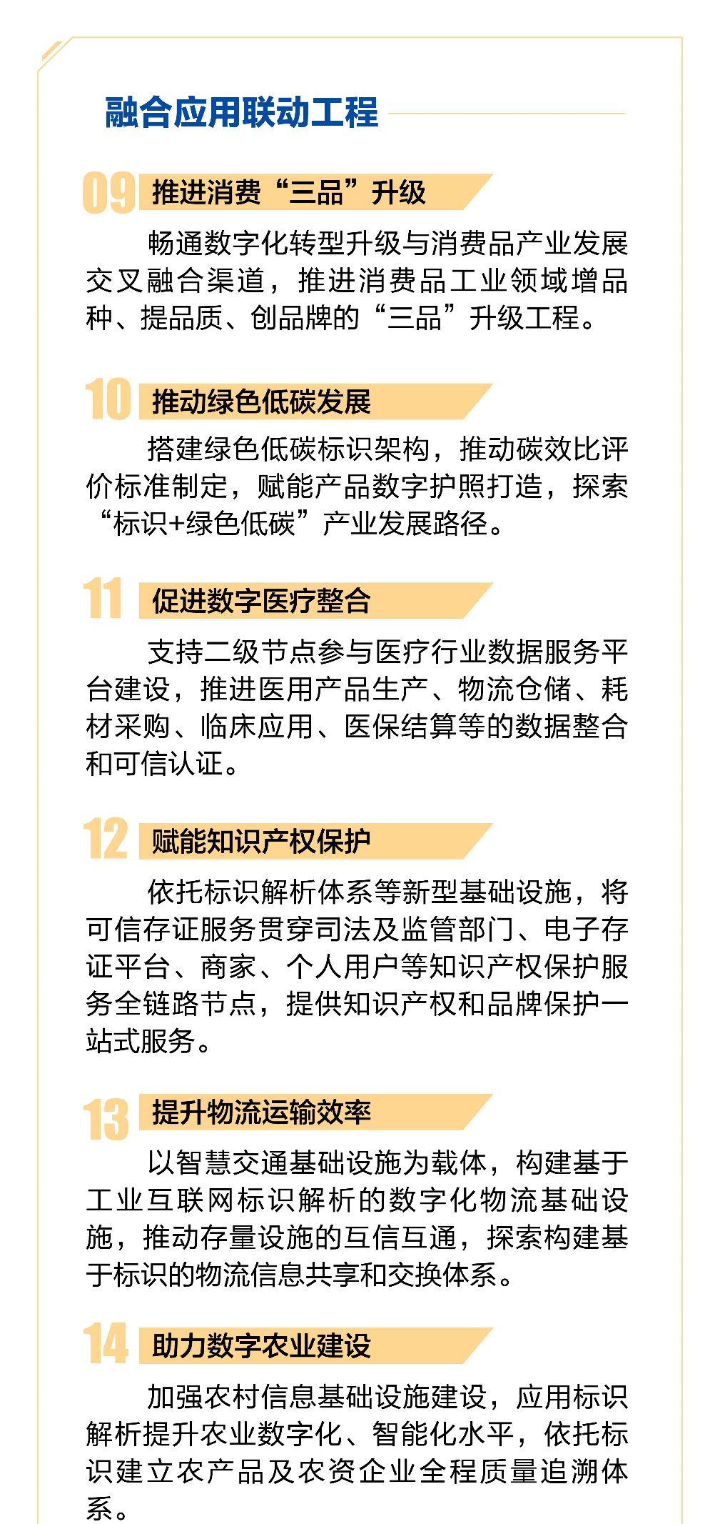 14.助力数字农业建设。加强农村信息基础设施建设,应用标识解析提升农业数字化、智能化水平。结合标识解析技术,建立农产品及农资企业全程质量追溯体系,实现农产品的追踪和溯源双向管理,促进农产品品牌保护和全流程质量追溯。支持省内标识解析二级节点参与区域性农产品标识管理平台建设,推进农产品生产、加工、运输、销售等全环节的标识化、数字化、品牌化,助力农产品产量、销量、质量的全方位提升。