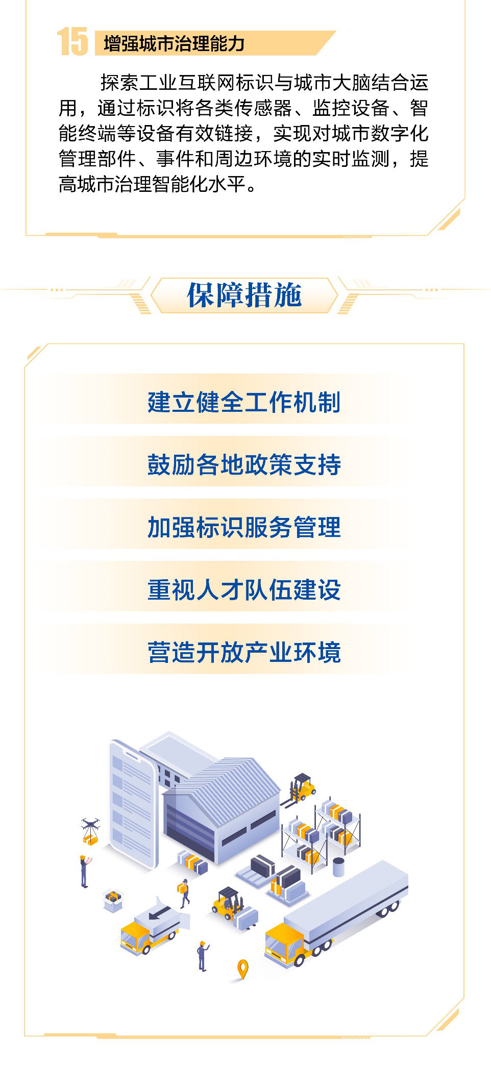 13.提升物流运输效率。以智慧港口、智慧公路、智慧铁路、智慧民航、智慧物流等智慧交通基础设施为载体,构建基于工业互联网标识解析的数字化物流基础设施,推动存量设施的互信互通。鼓励物流企业建立基于标识解析和可信资产认证的新型物流技术体系,面向仓储、干线运输、末端配送等场景重点设施部署主动标识载体、资产定位装置等智能设备。探索构建基于标识解析的物流信息共享和交换体系,加快开展标识在仓库档案管理、仓库库存同步等场景的创新实践。