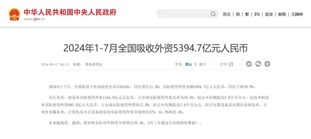 商务部:2024年1-7月全国吸收外资5394.7亿元人民币