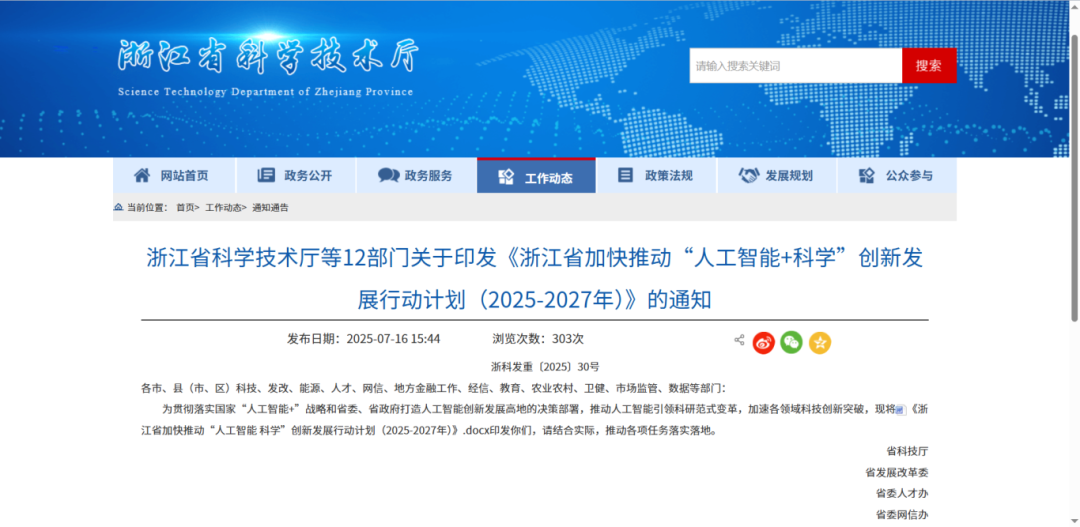 为贯彻落实国家“人工智能+”战略和省委、省政府打造人工智能创新发展高地的决策部署,推动人工智能引领科研范式变革,加速各领域科技创新突破,现将《浙江省加快推动“人工智能 科学”创新发展行动计划(2025-2027年)》印发你们,请结合实际,推动各项任务落实落地。